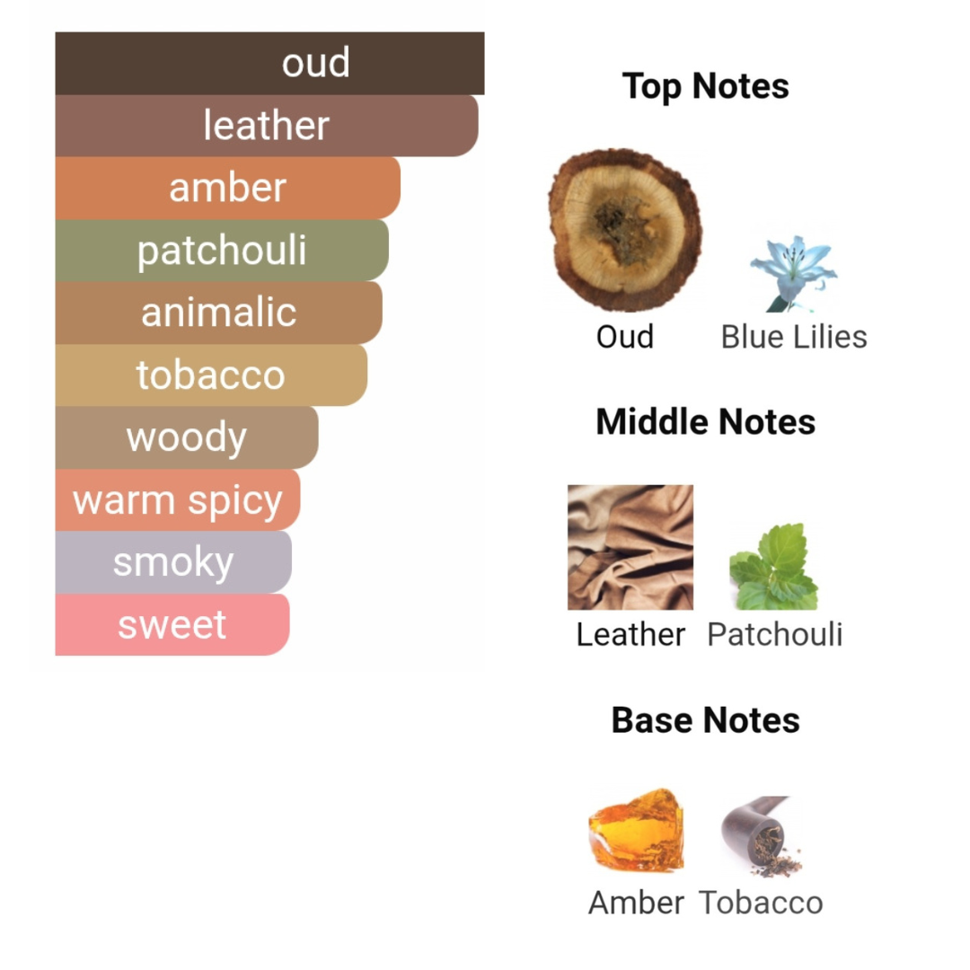 Silence descended before the tones began to dance, the notes of the oud began with boldness and stability, and the lily entered with delicate blue notes with a fragrant aroma and a breath-taking freshness. The place calms down and the mystery dissolves with a charming piece of patchouli and the scent of luxurious leather permeates and suddenly the notes meet on one tone mixed with amber and tobacco to reveal a wonderful fragrance with a perfect blend